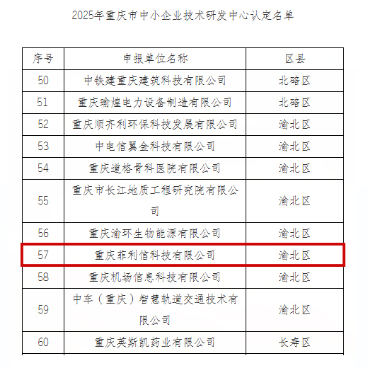 近日,重庆市经济和信息化委员会公布了 《关于公布2025年重庆市中小企业技术研发中心认定名单及复核结果的通知》,重庆菲利信科技有限公司正式获评“重庆市中小企业技术研发中心”。